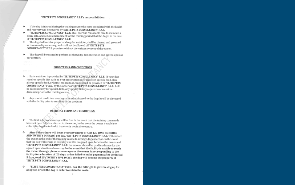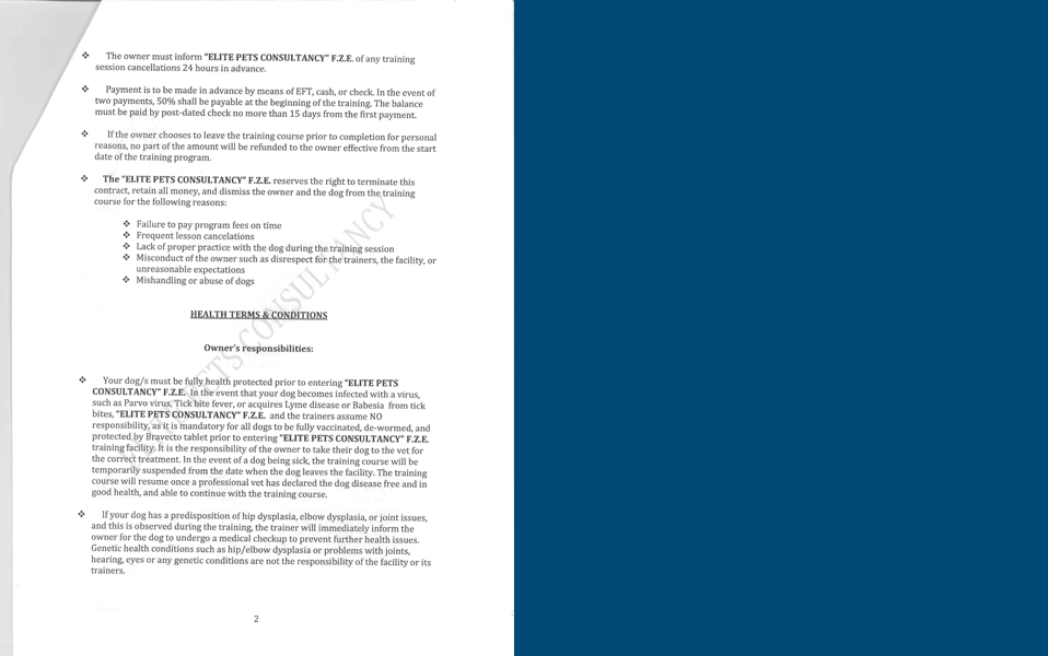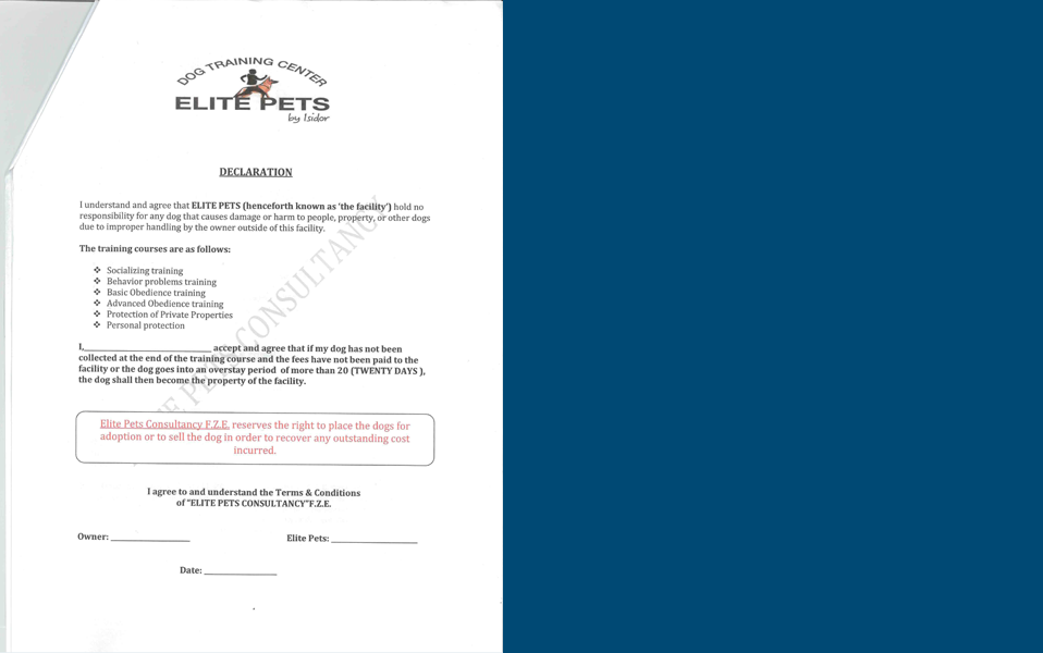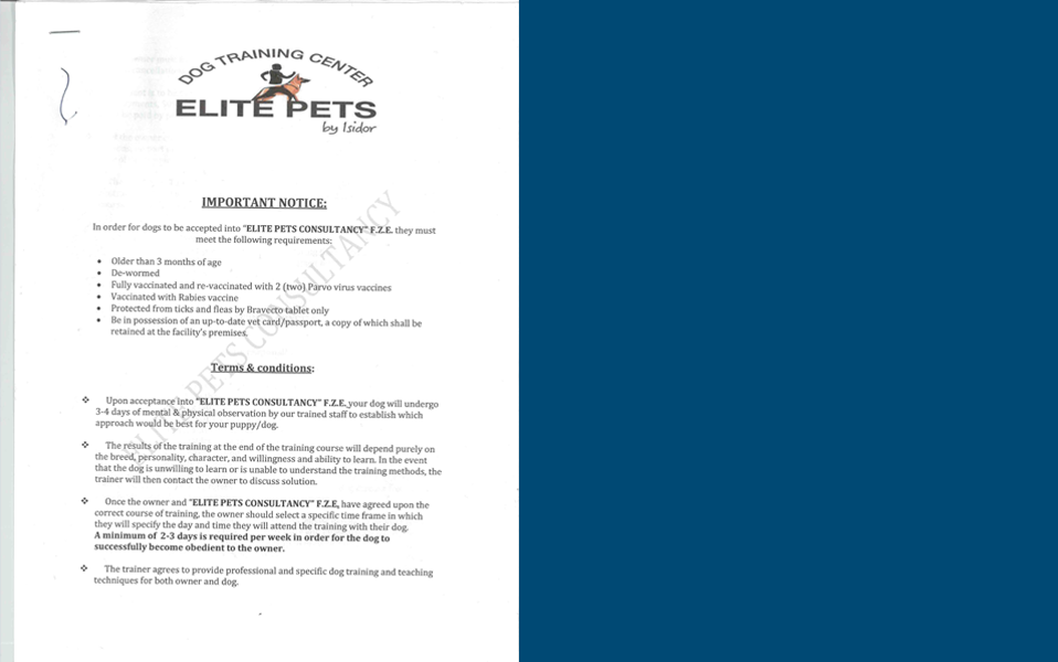 Here are some terms and conditions for the dog to be accepted in our training centre in the training course.